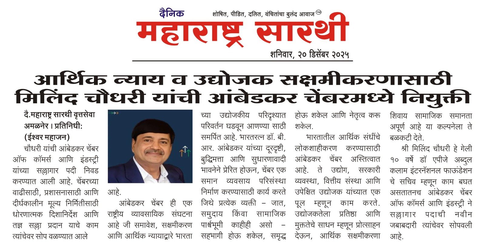 Milind Chaudhari has been appointed to the advisory committee of the Ambedkar Chamber of Commerce and Industry, strengthening its leadership and institutional guidance, as reported by the Marathi Daily Newspaper महाराष्ट्र सारथी