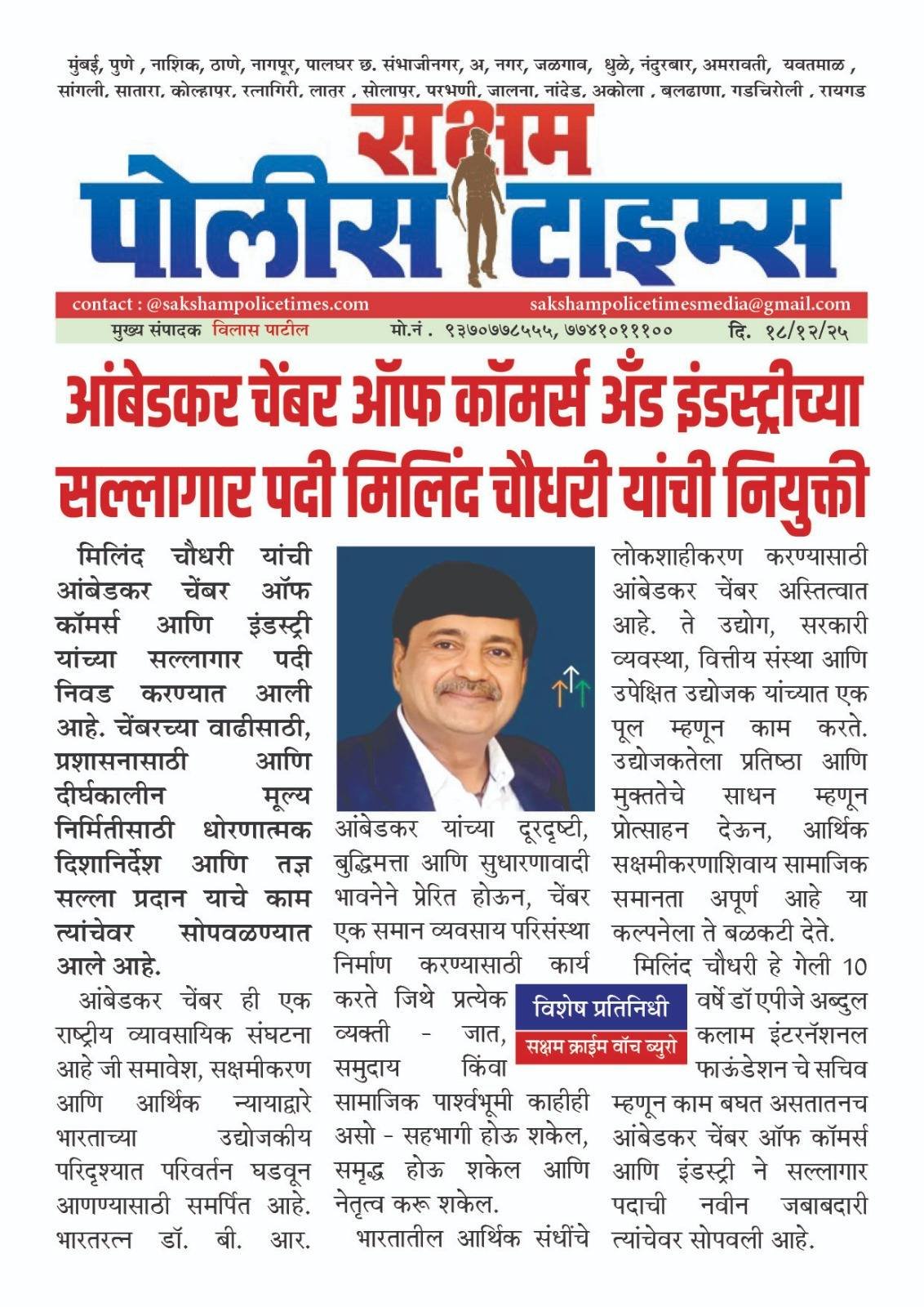 Milind Chaudhari has been appointed to the advisory committee of the Ambedkar Chamber of Commerce and Industry, strengthening its leadership and institutional guidance, as reported by the Marathi Newspaper सक्षम पोलीस टाइम्स.